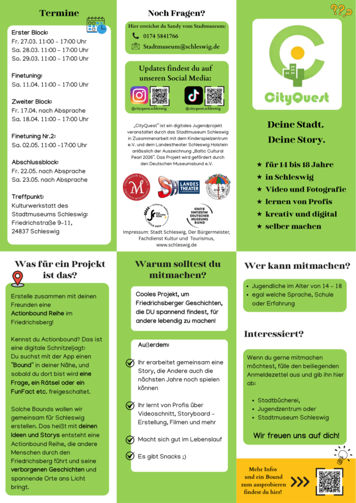 „Mit CityQuest möchten wir Jugendlichen die Möglichkeit geben, ihren Stadtteil aus neuen Perspektiven zu entdecken, eigene Geschichten zu erzählen und kreative Ideen digital umzusetzen. So wird Schleswig und der Friedrichsberg für alle sichtbar lebendig“, sagt Sandy Ziegeler, Museumspädagogin vom Stadtmuseum Schleswig.