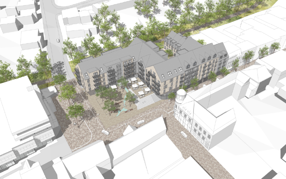 Vorgesehen ist die Errichtung eines vier- bis fünfgeschossigen Gebäudekomplexes entlang des Stadtwegs und des künftigen öffentlichen Stadtplatzes an der Ecke Moltkestraße/Stadtweg. Ergänzend ist im rückwärtigen Bereich zur Michaelisallee eine Reihenhausbebauung geplant.