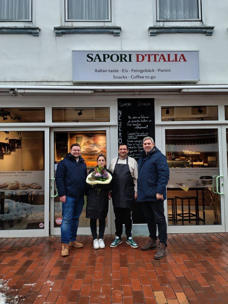(CIS-intern) – Seit Montag ist das italienische Bistro „Sapori d’Italia“ im Stadtweg 12 geöffnet. Am gestrigen Tag gratulierten Bürgermeister Jonas Kähler und Helge Schütze von der Stadtmarketing Schleswig GmbH den Inhaber*innen Alessandra und Fabio Casto persönlich zur Neueröffnung und wünschten ihnen viel Erfolg für den Start. Mit „Sapori d’Italia“ hat […]